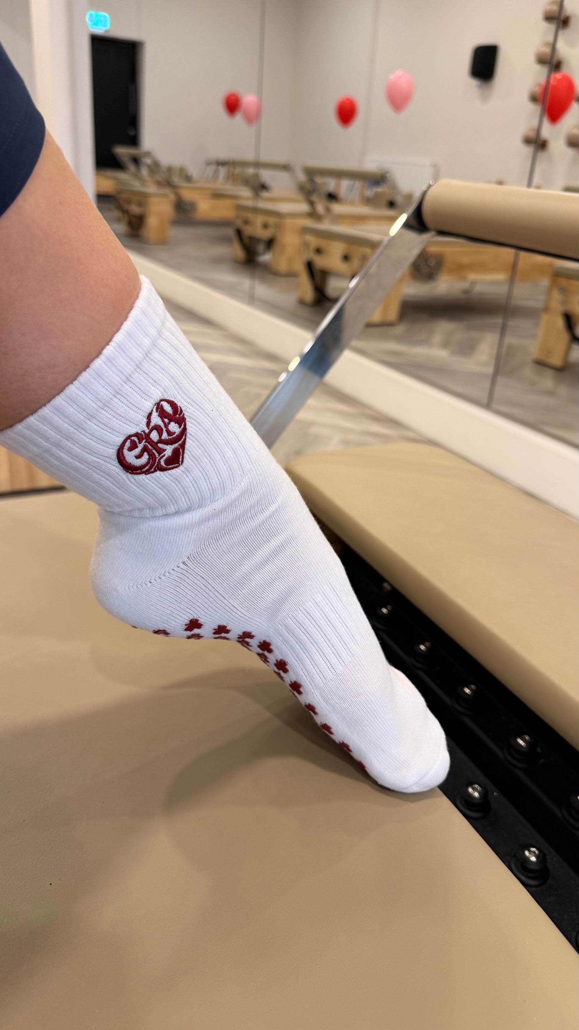 Our Grá grip socks are a timeless staple from the Grá & Mná Collection — clean, classic white with a rich red embroidered heart detail. A simple statement that means everything.